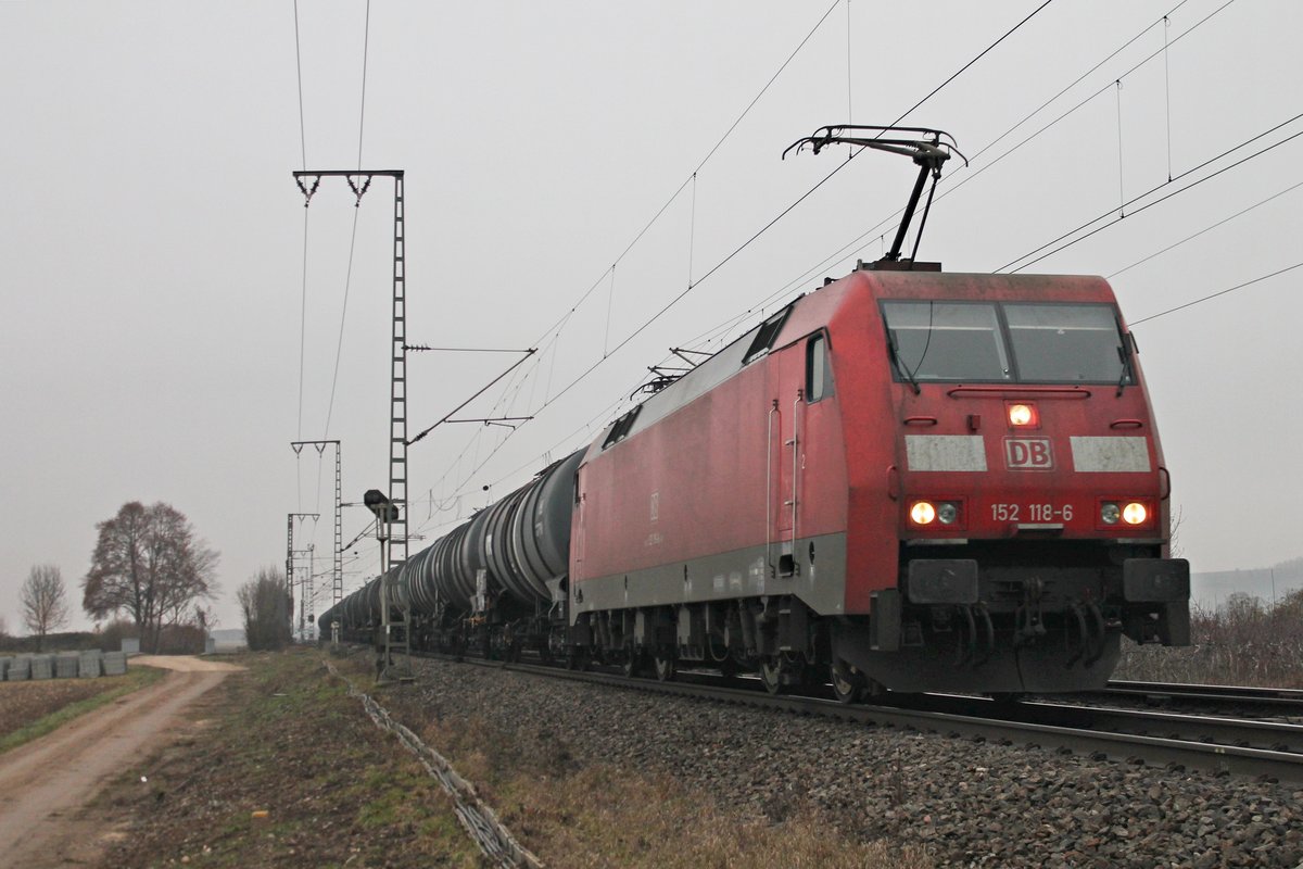 Mit einem langen Kesselzug fuhr am 20.12.2016 die 152 118-6 nördlich von Müllheim (Baden) auf der KBS 703 in Richtung Schweizer Grenze.
