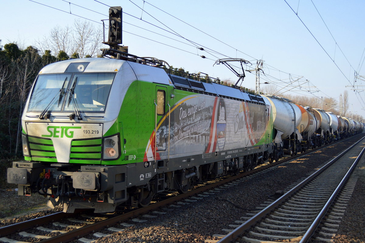 SETG mit der ELL Vectron 193 219 und Kesselwagenzug (Kreideschlamm) am 08.02.18 Berlin-Hohenschönhausen.