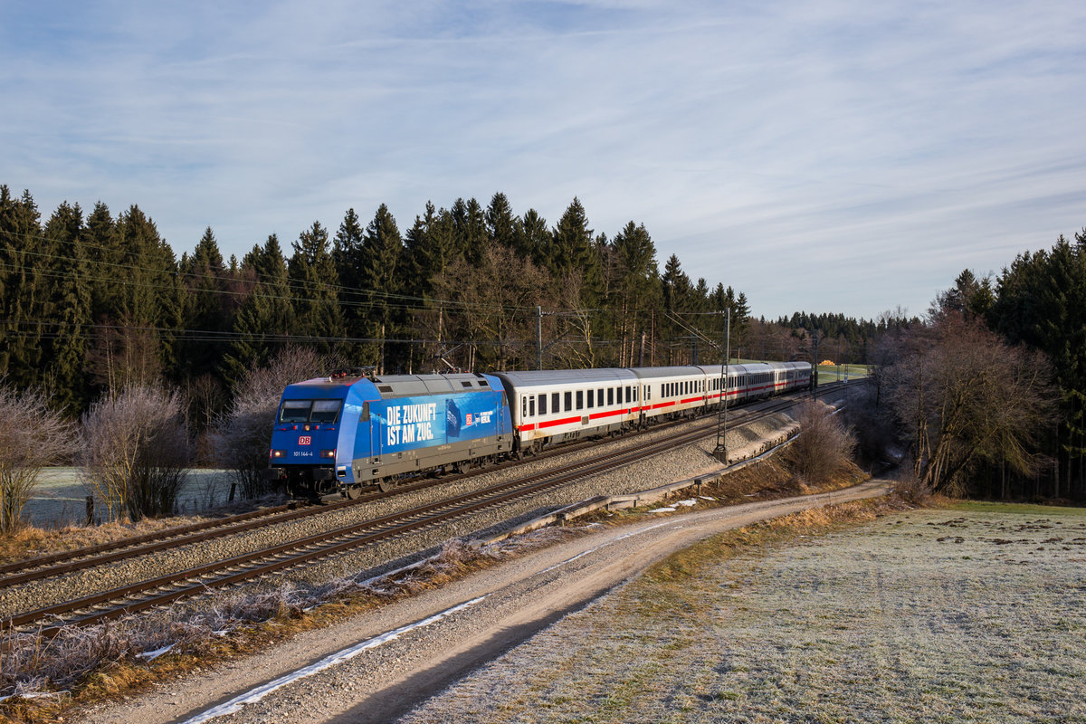 101 144 "Hertha BSC", die seit einigen Monaten in neuem Farbkleid durch die Republik fährt, war am 26. Dezember 2017 am IC 2082 "Königsee", aufgenommen bei Grabenstätt.