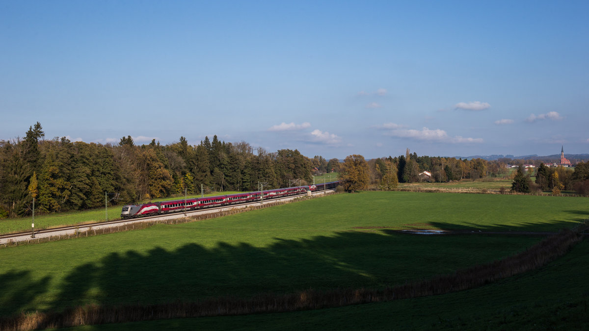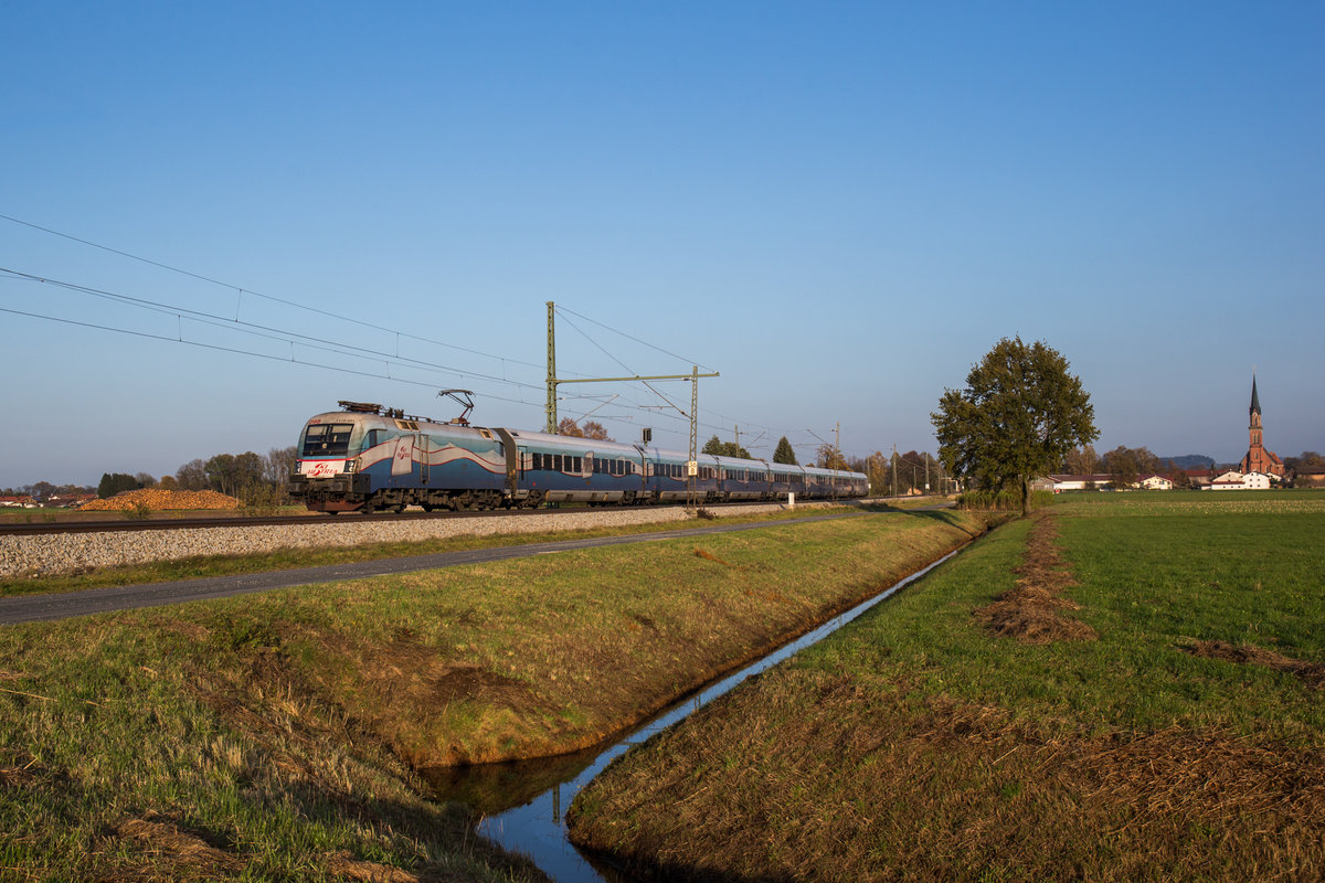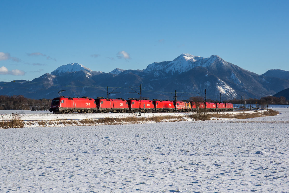Die farblich zumindest auf einer Seite passende 193 777 von Lokomotion durfte im Dezember einen TEE zum Wörthersee bringen, am 29. Dezember 2017 ist sie zwischen Prien und Bernau unterwegs.