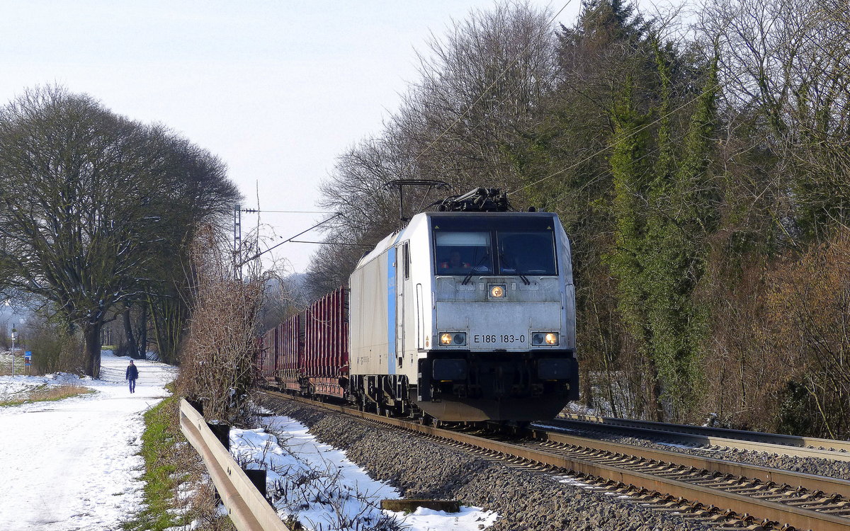 186 183-0 von Railpool kommt die Gemmenicher-Rampe herunter nach Aachen-West mit einem Güterzug aus Antwerpen-Noord(B) nach Köln-Gremberg(D). Aufgenommen an der Montzenroute am Gemmenicher-Weg.