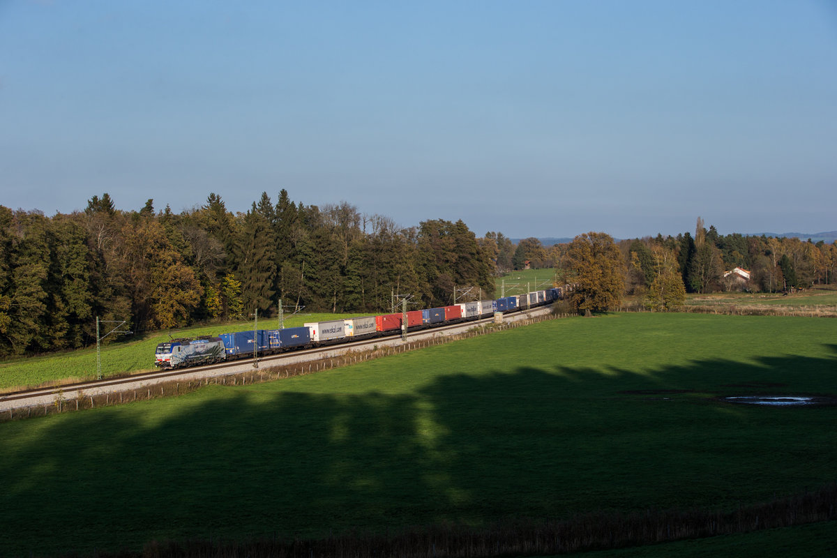193 773 von Lokomotion fährt mit einem EKOL bei Übersee in Richtung München, aufgenommen am 3. November 2017.