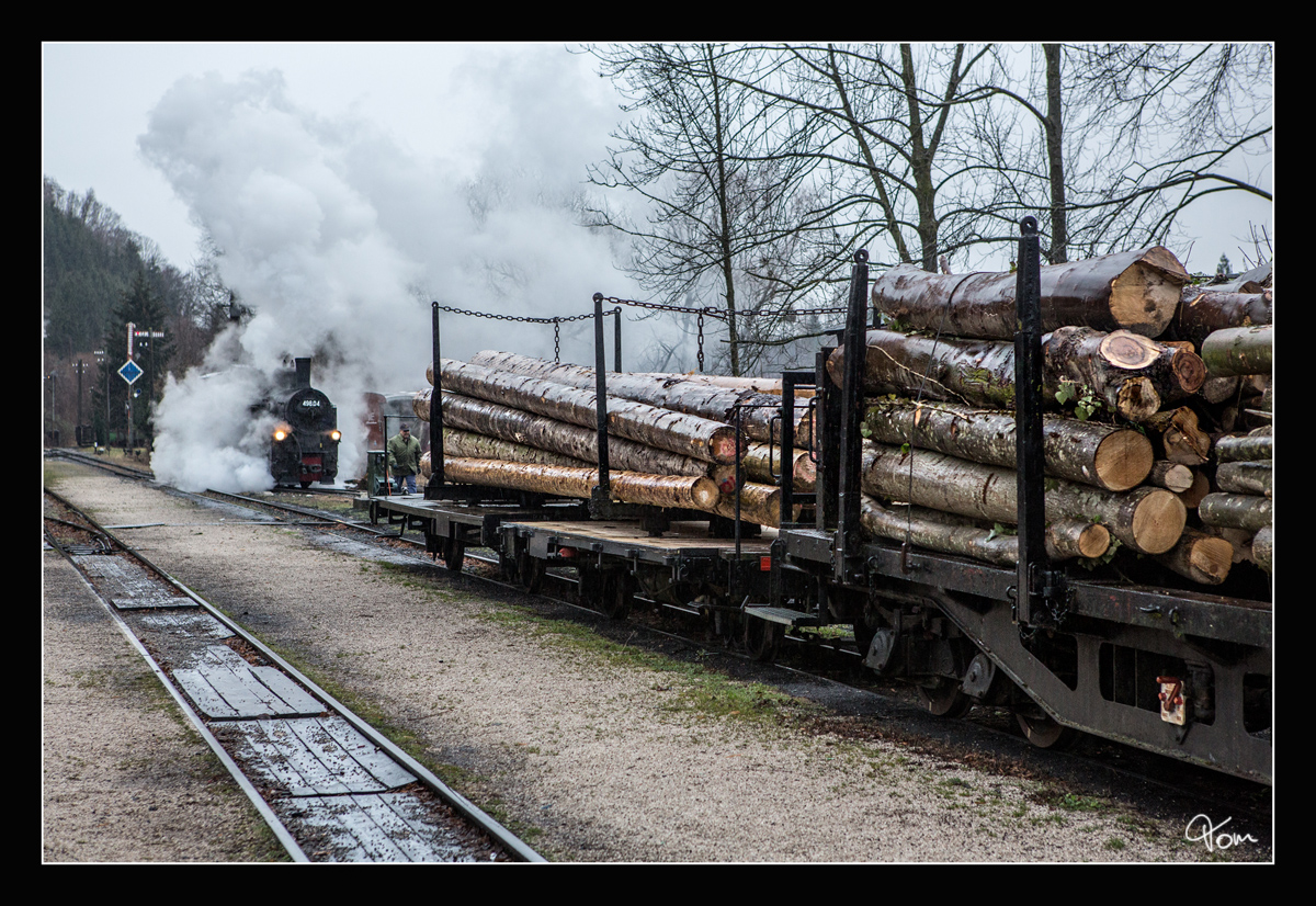498.04 dampft mit einem Holzzug aus der Haltestelle Sommerhubermühle.