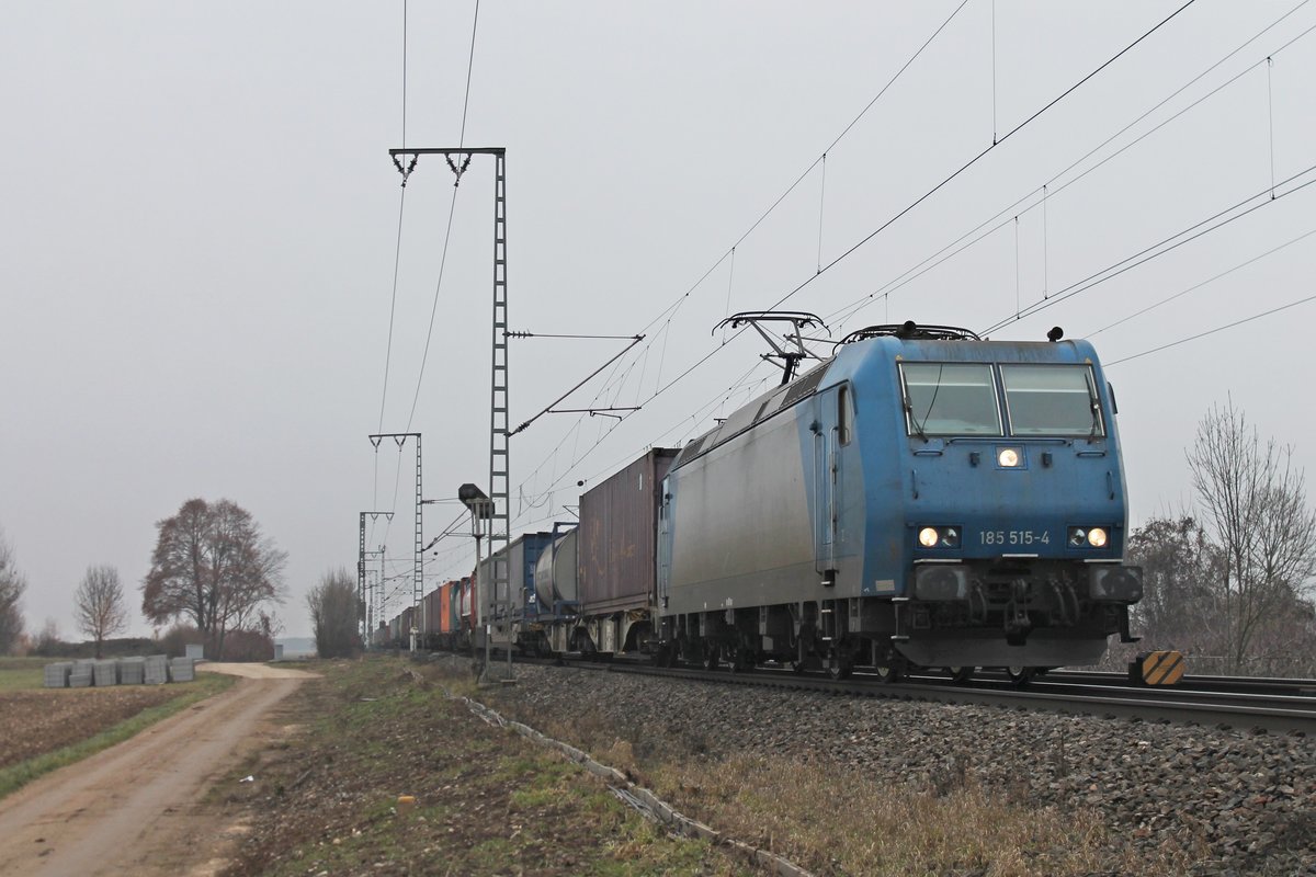 Am 21.12.2016 fuhr ATLU/RTX 185 515-4 mit einem Containerzug aus Belgien, den sie seit Aachen West bespannte, bei Müllheim (Baden) in Richtung Schweiz, den sie dort an Schweizer Loks übergeben wird.