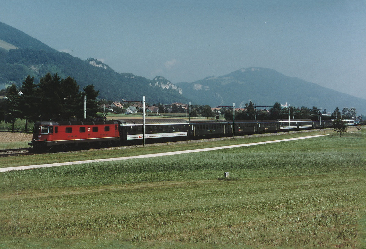 Bunt gemischter ICN-Ersatz mit der Re 6/6 11610 Spreitenbach bei Niederbipp am 18. August 2001.