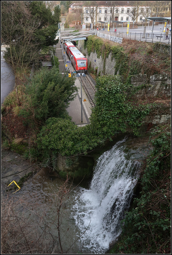 Oben der Wasserfall, unten der Zug. Der Bahnhof Überlingen, der durch seine Lage zwischen Mauern auch sehr gut zu den alten Festungsgräben der Stadt Überlingen passt.