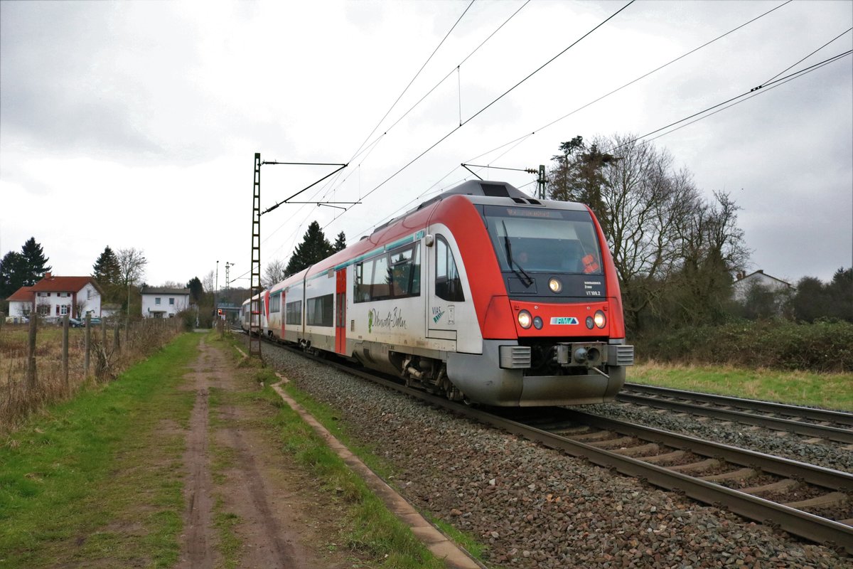 VIAS/Odenwaldbahn Bombardier Itino VT09+VTxxx (BR 615) am 10.02.18 bei Hanau West. Normalerweise Fahren diese Züge über Offenbach Südmainisch aber wegen einer Baustelle wurden Sie Nordmainisch umgeleitet