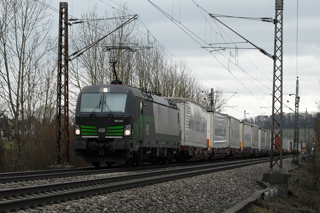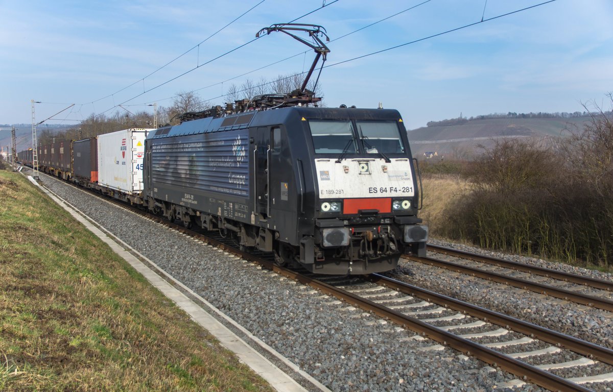 ES 64 F4-281 (E189-281) ist mit einen Containerzug am 07.02.2018 bei Würzburg/Süd unterwegs.