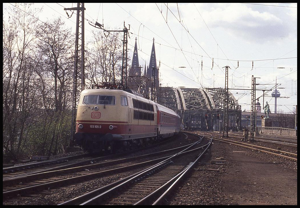 103105 hat mit dem IC 500 Heinrich der Löwe Köln HBF verlassen und fährt hier am 25.3.1993 vor der Kulisse der Hohenzollernbrücke und den Türmen des Doms in Köln Deutz ein.