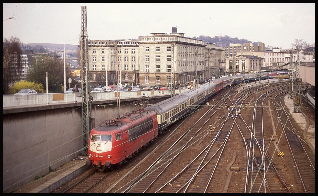 103241 fährt hier am 24.3.1993 mit einem Eurocity in die Schweiz um 16.20 Uhr aus dem HBF Wuppertal Elberfeld ab.