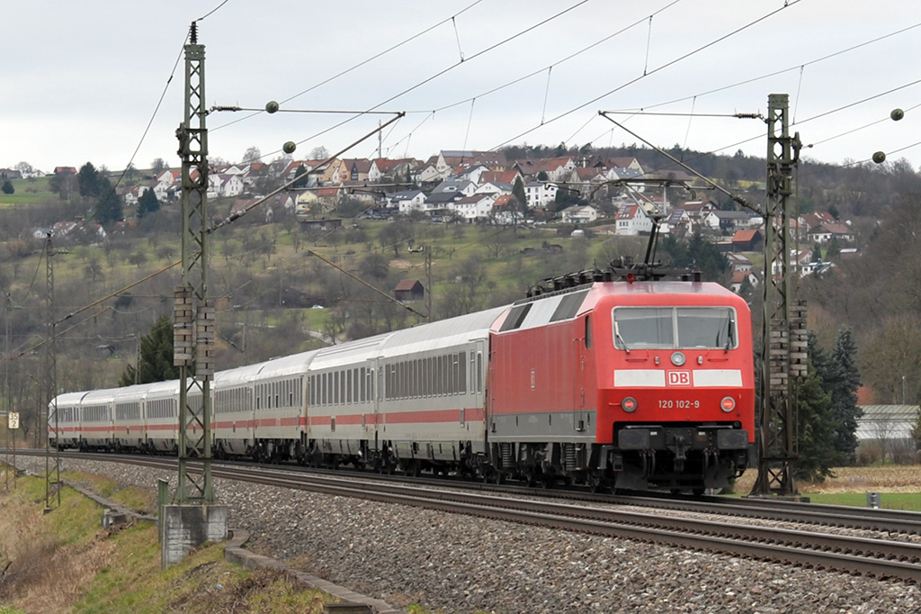 120 155 schleppt am 13.02.2018 eine kalte 101 mit einem IC über die Schwäbische Alb bei Westerstetten.