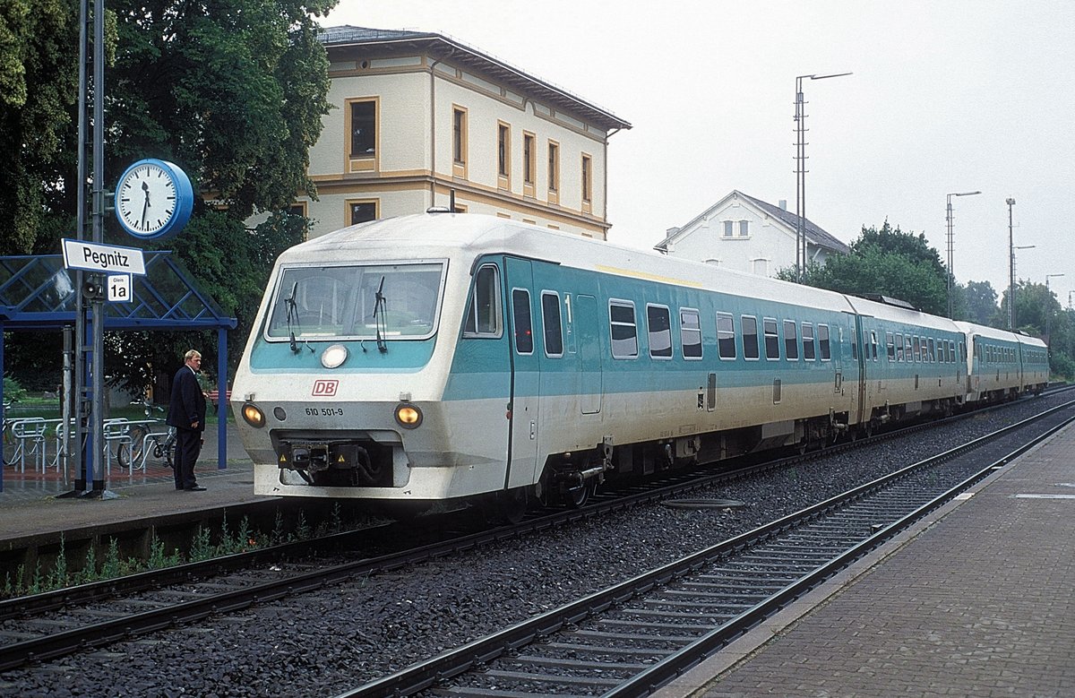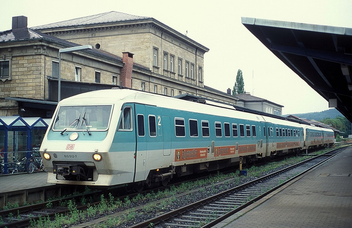 Abfahrt eines IRE-Dieseltriebzuges der Baureihe 611 in Richtung Basel im Bahnhof Überlingen.