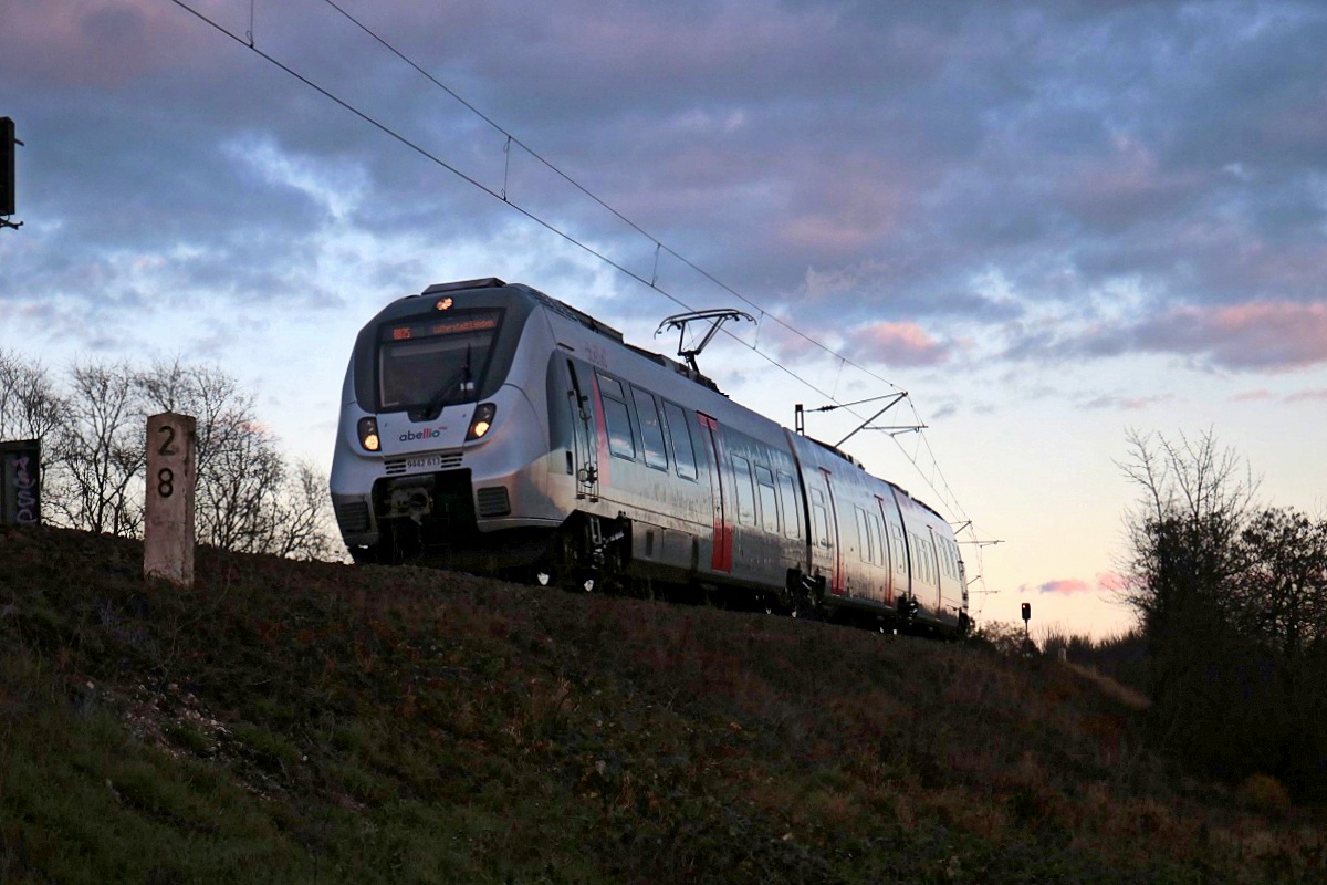 Nachschuss auf 9442 113 (Bombardier Talent 2) von Abellio Rail Mitteldeutschland als RB 74781 (RB75) von Lutherstadt Eisleben nach Halle(Saale)Hbf, die bei Böllberg-Wörmlitz auf der Bahnstrecke Halle–Hann. Münden (KBS 590) fährt. Bild durchlief die Selbstfreischaltung. [29.12.2017 | 15:17 Uhr]