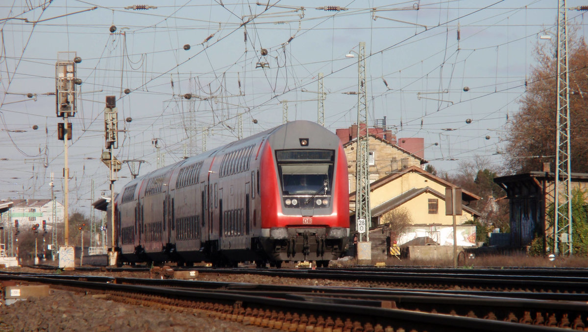 Durch die Tieflage der unteren Fahrgastebene im Doppelstockwagen ergibt sich eine besondere Perspektive auf den Bahnsteig.
