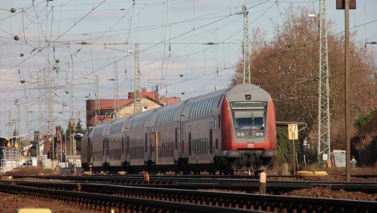 Ein Dosto Steuerwagen hat soeben Biblis verlassen und wird nun von 146 003 nach Mannheim geschoben. Aufgenommen am 13.02.2018.