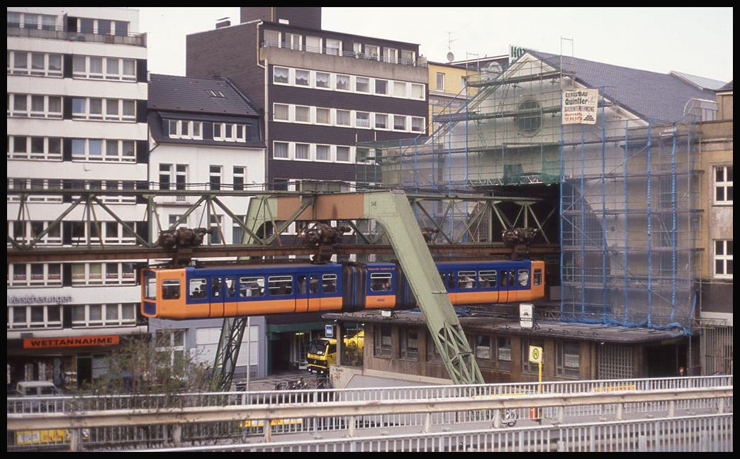 Eine Schwebebahn verlässt hier am 24.3.1993 in Wuppertal Elberfeld die Station in Richtung Vohwinkel.