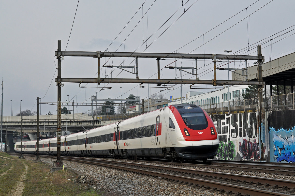 ICN 500 013 "Denis de Rougemont" fährt Richtung Bahnhof Muttenz. Die Aufnahme stammt vom 05.02.2018.