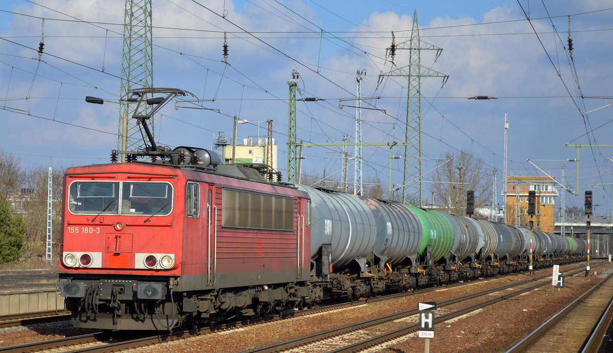 Railpool 155 180-3 mit Kesselwagenzug (Dieselkraftstoff) am 13.02.18 Bf. Flughafen Berlin-Schönefeld.
