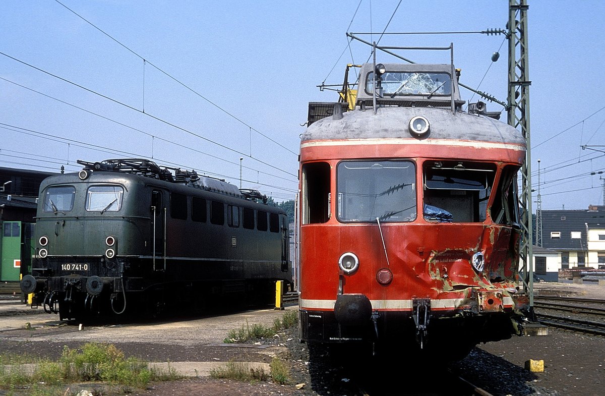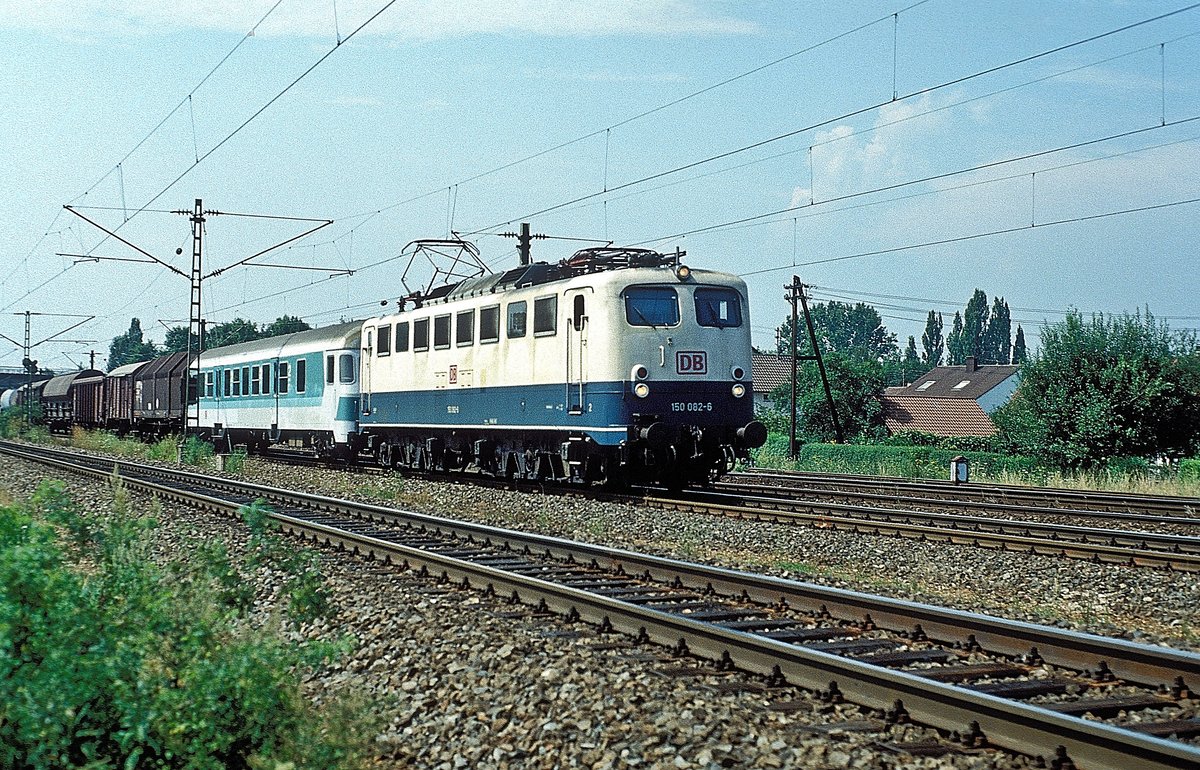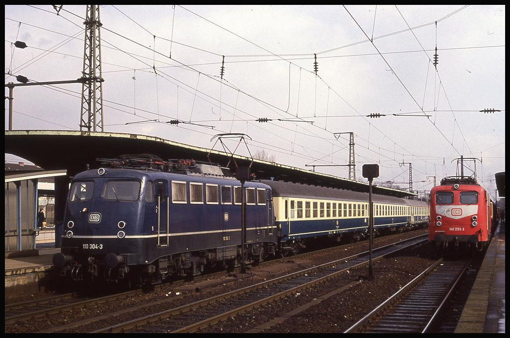 Die blaue 110304 steht hier am 25.3.1993 um 14.04 Uhr mit dem E nach Mönchengladbach im Bahnhof Köln Deutz. Rechts ist 140235 zu sehen, die vor einem Nahverkehrszug nach Duisburg wartet.