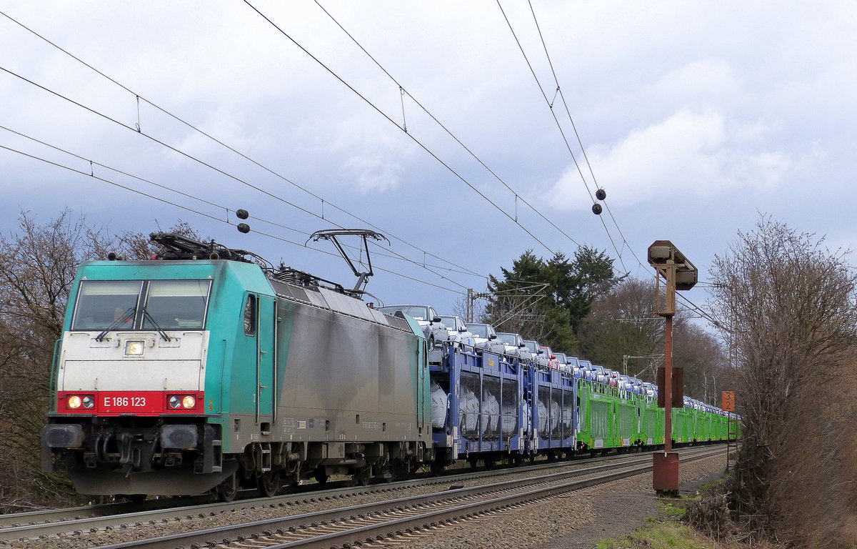 186 123 von Railtraxx kommt aus Richtung Aachen-West und fährt die Gemmenicher-Rampe hoch mit einem Jaguar-Autozug aus Graz-Vbf(A) nach Zeebrugge(B) und fährt in Richtung Montzen/Belgien.