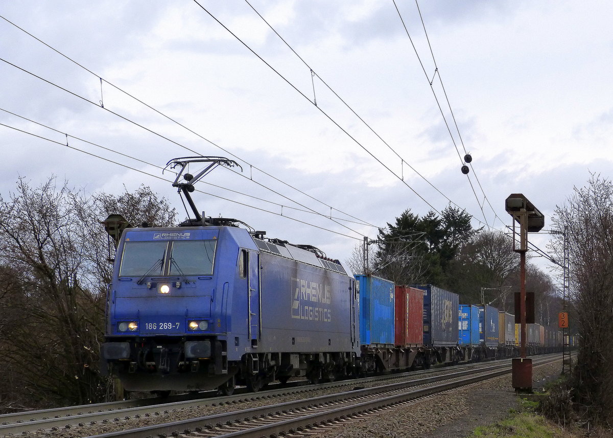 186 269-7 von Rhenus-Logistik kommt aus Richtung Aachen-West und fährt die Gemmenicher-Rampe hoch mit einem GTS-Containerzug aus Piacenza(I) nach Zeebrugge-Ramskapelle(B) und fährt in Richtung Montzen/Belgien.
