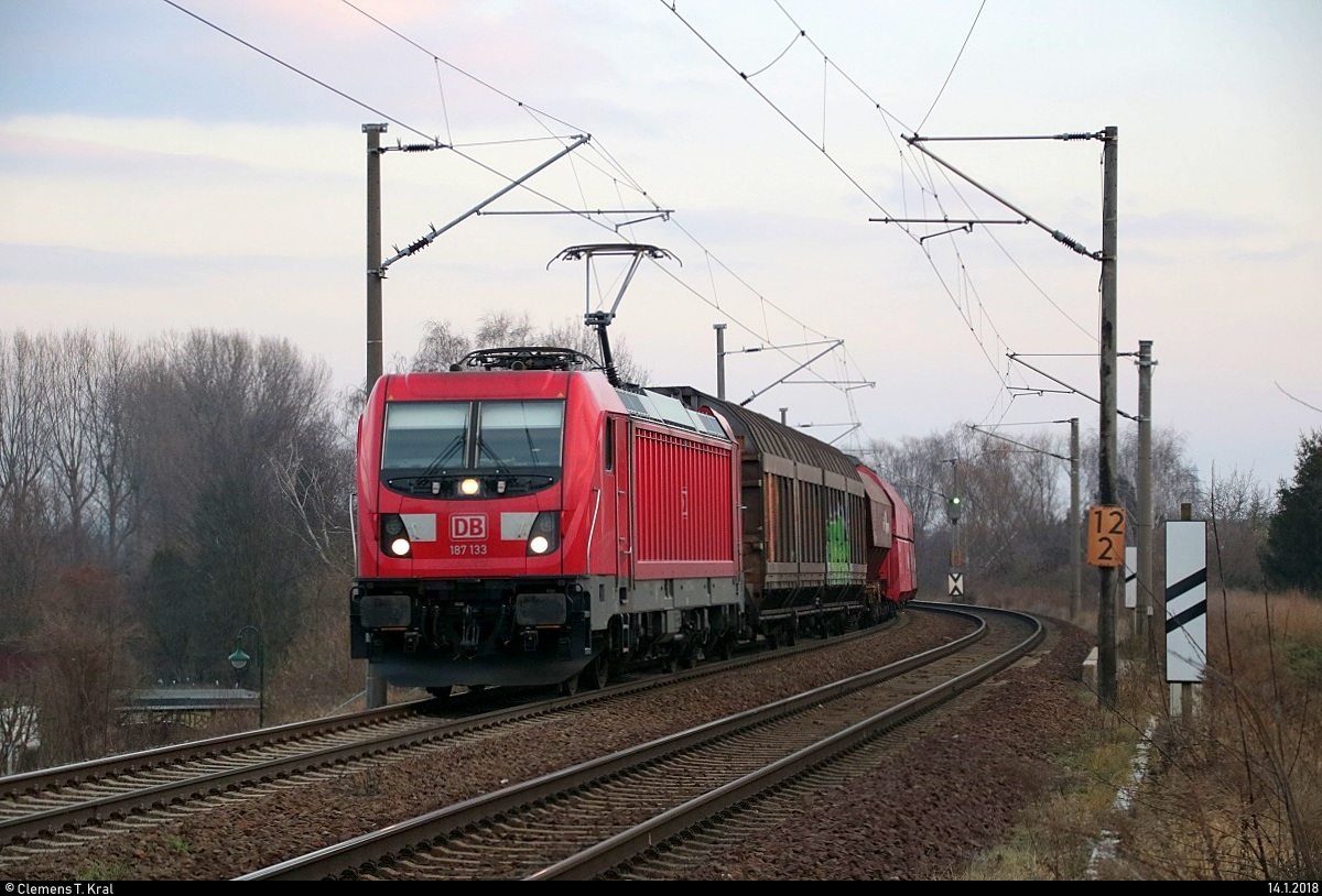 187 133 DB als gemischter Gz fährt in Zscherben, Angersdorfer Straße, auf der Bahnstrecke Halle–Hann. Münden (KBS 590) Richtung Teutschenthal. [14.1.2018 | 15:42 Uhr]