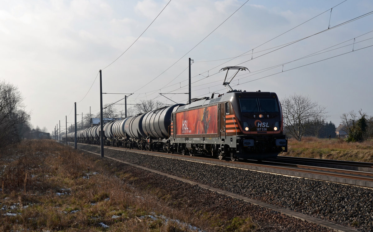 187 536 der HSL führte am 10.02.18 Löwenstark ihren Kesselwagenzug durch Brehna Richtung Bitterfeld.