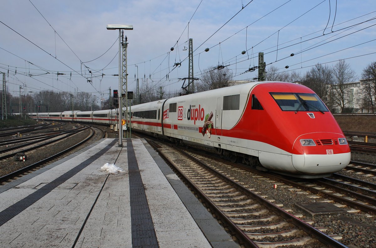 Der Duplo-ICE 401 012 fuhr am 10.02.18 als ICE 707 von Hamburg nach München. Hier durcheilt die Praline Brehna Richtung Halle(S).