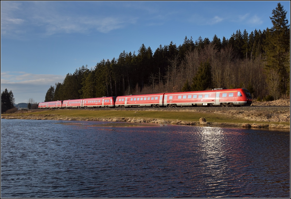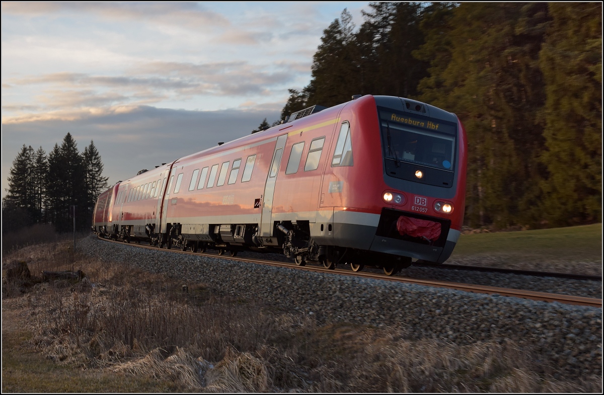 612 057 und 612 059 neigen sich beim Kraftwerk Ruderatshofen unter den letzten Sonnenstrahlen des Tages in die Kurve. Februar 2018.