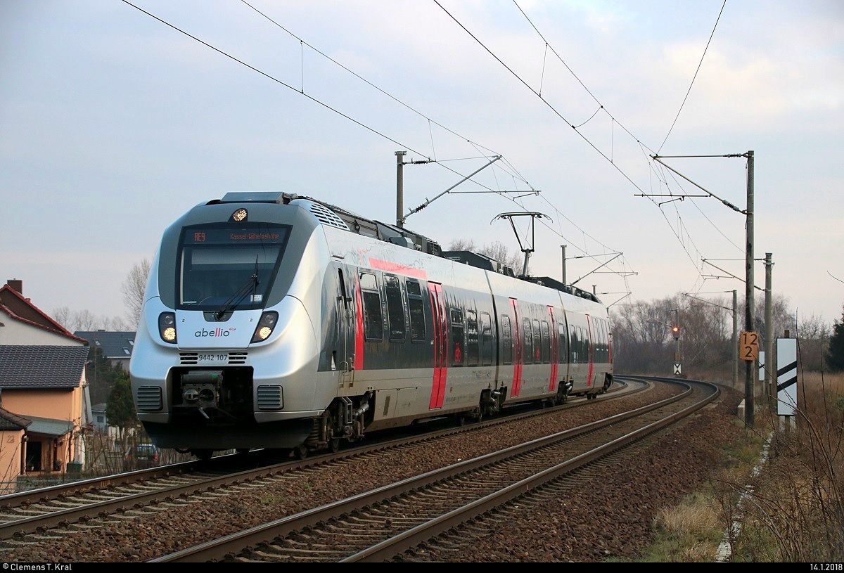 9442 107 (Bombardier Talent 2) von Abellio Rail Mitteldeutschland als RE 74712 (RE9) von Halle(Saale)Hbf nach Kassel-Wilhelmshöhe fährt in Zscherben, Angersdorfer Straße, auf der Bahnstrecke Halle–Hann. Münden (KBS 590). [14.1.2018 | 15:08 Uhr]