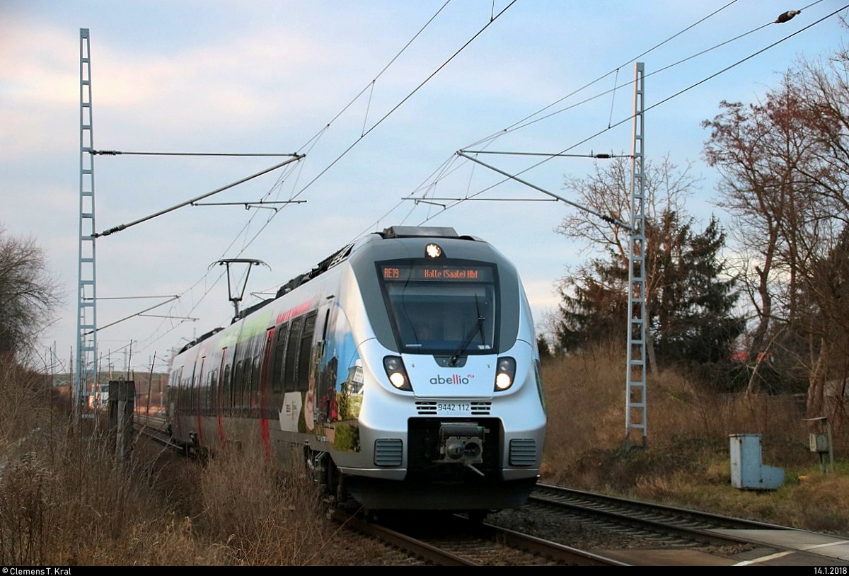 9442 112 (Bombardier Talent 2) von Abellio Rail Mitteldeutschland als RE 74733 (RE19) von Leinefelde nach Halle(Saale)Hbf fährt in Zscherben, Angersdorfer Straße, auf der Bahnstrecke Halle–Hann. Münden (KBS 590). Aufgenommen hinter der Anrufschranke. [14.1.2018 | 15:47 Uhr]
