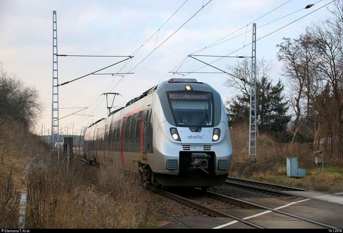 9442 117 (Bombardier Talent 2) von Abellio Rail Mitteldeutschland als RE 74711 (RE9) von Kassel-Wilhelmshöhe nach Halle(Saale)Hbf Gl. 13a fährt in Zscherben, Angersdorfer Straße, auf der Bahnstrecke Halle–Hann. Münden (KBS 590). Aufgenommen hinter der Anrufschranke. [14.1.2018 | 14:46 Uhr]