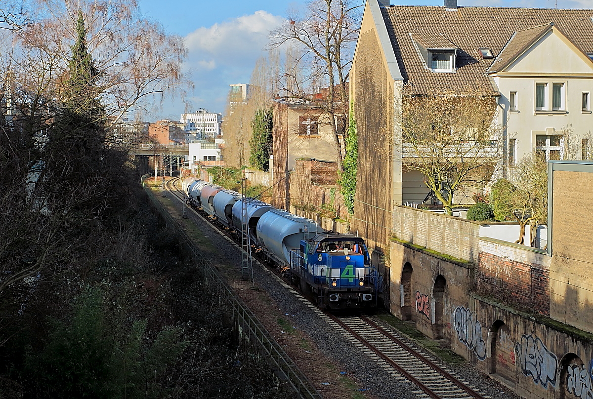 Am 16.02.2018 fährt die NIAG-Lok 4 (Deutz 57399/1962, ex DB V 100 1162/211 162-3, 1996/97 Umbau bei Vossloh zur DH 1004) mit dem Sodazug auf der Güterumgehungsbahn entlang der Hinterhöfe von Düsseldorf-Flingern in Richtung Reisholz. Links daneben ist die inzwischen vom Grün bewachsene Trasse des früheren zweiten Gleises noch erkennbar.