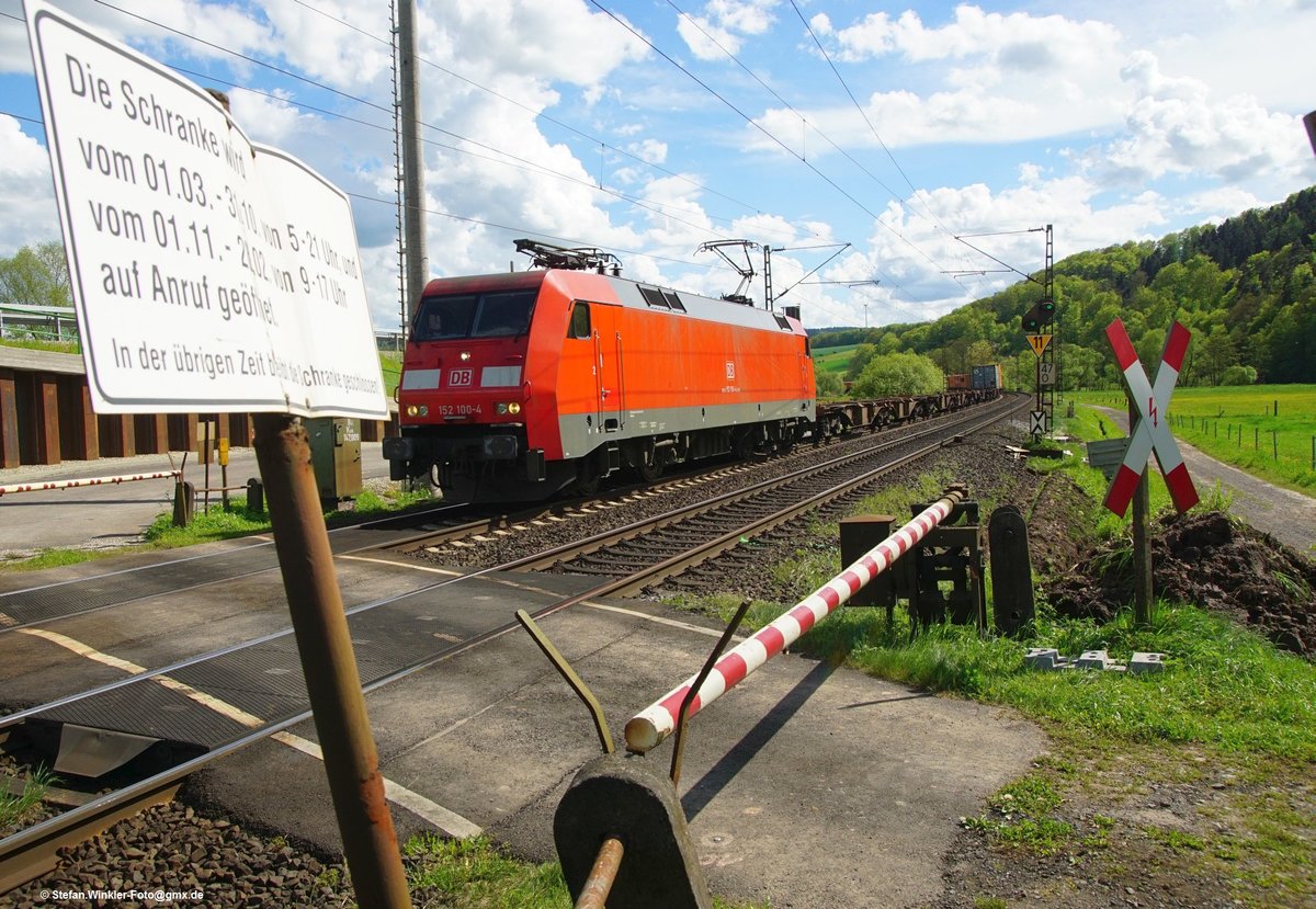 An der Nord-Süd-Strecke südlich von Unterhaun war am 13.05.2017 dieser BÜ zu finden, der nur gewisse Betriebszeiten hat. 152 100 fährt unterdessen unbeirrt mit ihrem Gz nach Norden.