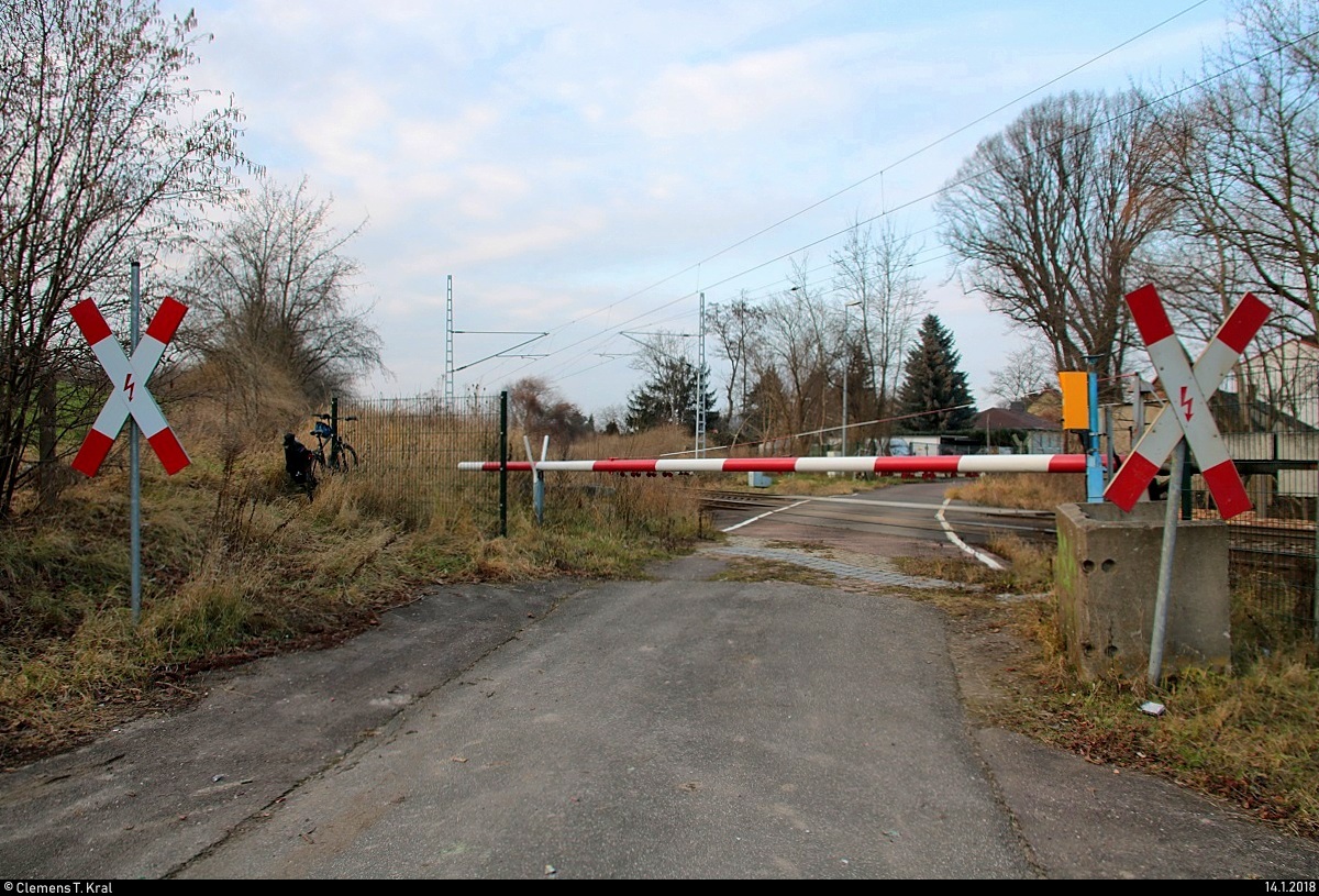 Blick auf den Bahnübergang Zscherben, Angersdorfer Straße, auf der Bahnstrecke Halle–Hann. Münden (KBS 590). Dieser wird nur bei Bedarf geöffnet (Anrufschranke), daher sind die Schranken sonst dauerhaft geschlossen. [14.1.2018 | 15:14 Uhr]