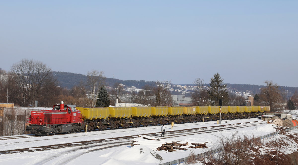 DH 1700.1 rauscht mit einem Wagensatz Abraumwagen in den Bahnhof Deutschlandsberg.