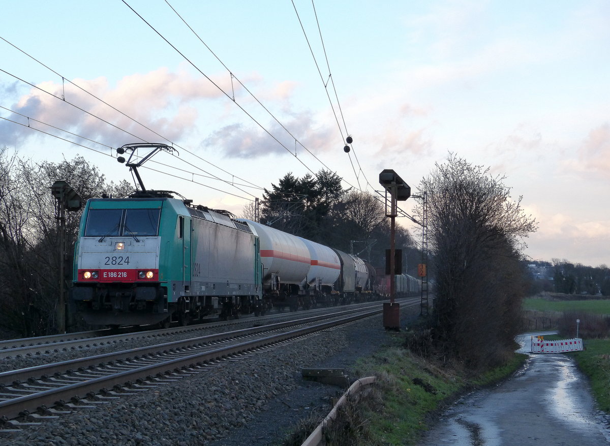 Die Cobra 2824 kommt aus Richtung Aachen-West und fährt die Gemmenicher-Rampe hoch mit einem gemischten Güterzug aus Köln-Gremberg(D) nach Antwerpen-Noord(B) und fährt in Richtung Montzen/Belgien. Aufgenommen an der Montzenroute am Gemmenicher-Weg. In der Abendstimmung am Kalten Abend vom 11.2.2018