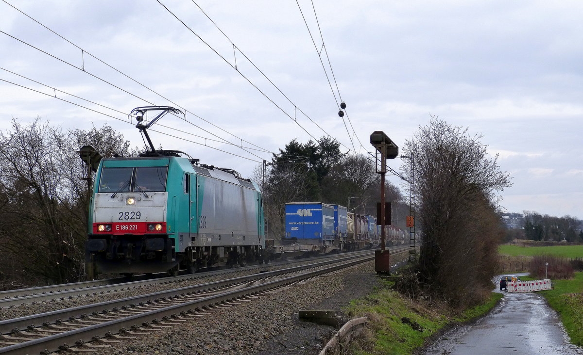 Die Cobra 2829 kommt aus Richtung Aachen-West und fährt die Gemmenicher-Rampe hochgefahren mit einem langen Containerzug aus Gallarate(I) nach Antwerpen-Oorderen(B) und fährt in Richtung Montzen/Belgien.
