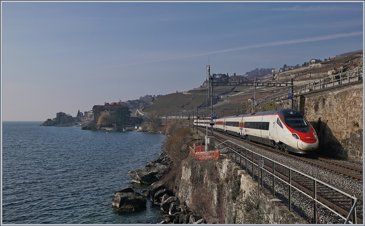 Das Bild zeigt den EC 39 von Genève nach Milano zwischen Rivaz und St-Saphorin.