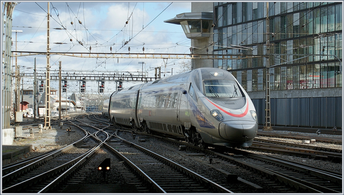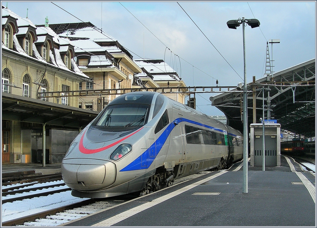 Ein FS Trenitalia ETR 610 hat Lausanne erreicht und wird nach einem kurzen Halt nach Milano weiter fahren.