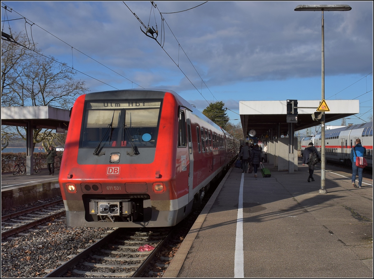 Gutes Wetter in der Fasnachtszeit und närrische Laune sogar beim 611 031 in Radolfzell. Ein echter Fasnachtssschelm ist bewirft die Leute mit Konfetti, der 611 mangels Konfetti mit Laub, das er neben dem Gleis beim Bremsen aufwirbel. Februar 2018.