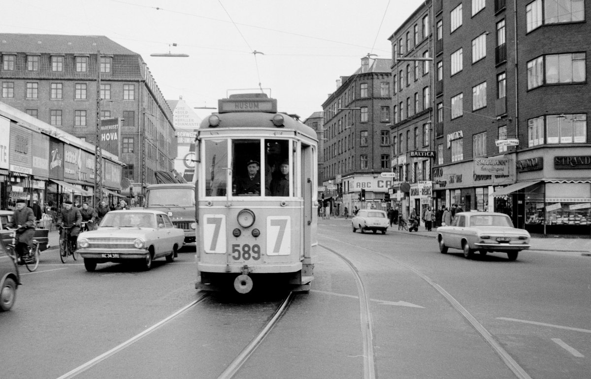 København / Kopenhagen Københavns Sporveje SL 7 (Tw 589) København N, Nørrebro, Nørrebrogade / Mimersgade / Lundtoftegade / Nørrebro Station im März 1969. - Scan eines S/W-Negativs. Film: Agfa L ISS.