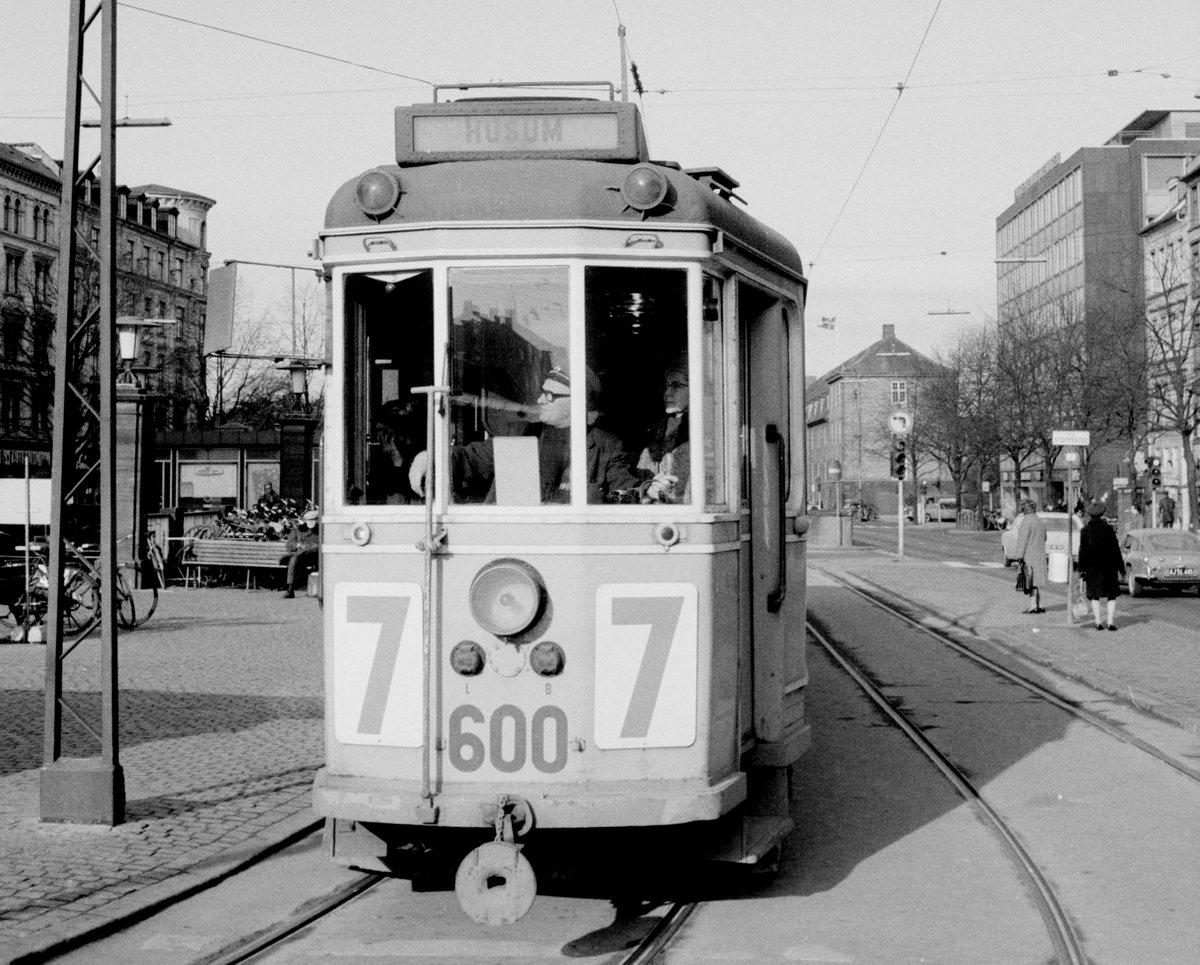 København / Kopenhagen Københavns Sporveje (KS) SL 7 (Tw 600) København N, Nørrebro, Nørrebrogade / Sjællandsgade im März 1969. - Der Drehgestellwagen 600 gehörte zu der KS-Triebwagenserie 501 - 617, die in den Jahren 1930 bis 1941 von der Hauptwerkstätte der KS hergestellt wurde. - Scan eines S/W-Negativs. Film: Agfa L ISS.