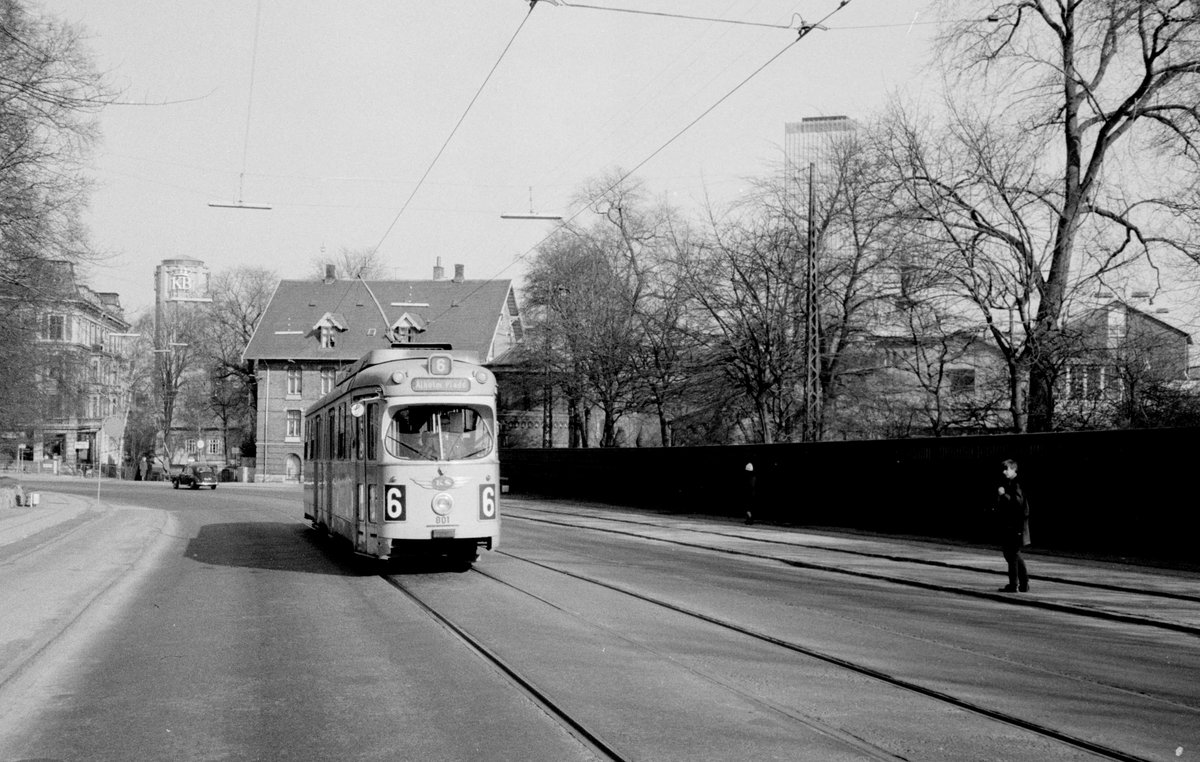 København / Kopenhagen Københavns Sporveje SL 6 (DÜWAG-GT6 803) Frederiksberg, Pile Allé / Kammasvej im März 1969. - Scan eines S/W-Negativs. Film: Agfa L ISS.