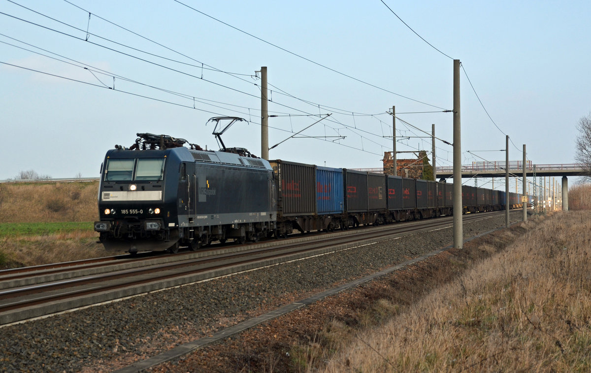 Mit einem BlackBoxx/BlueBoxx-Zug am Haken rollte 185 555 für die CFL am 10.02.18 durch Brehna Richtung Halle(S).