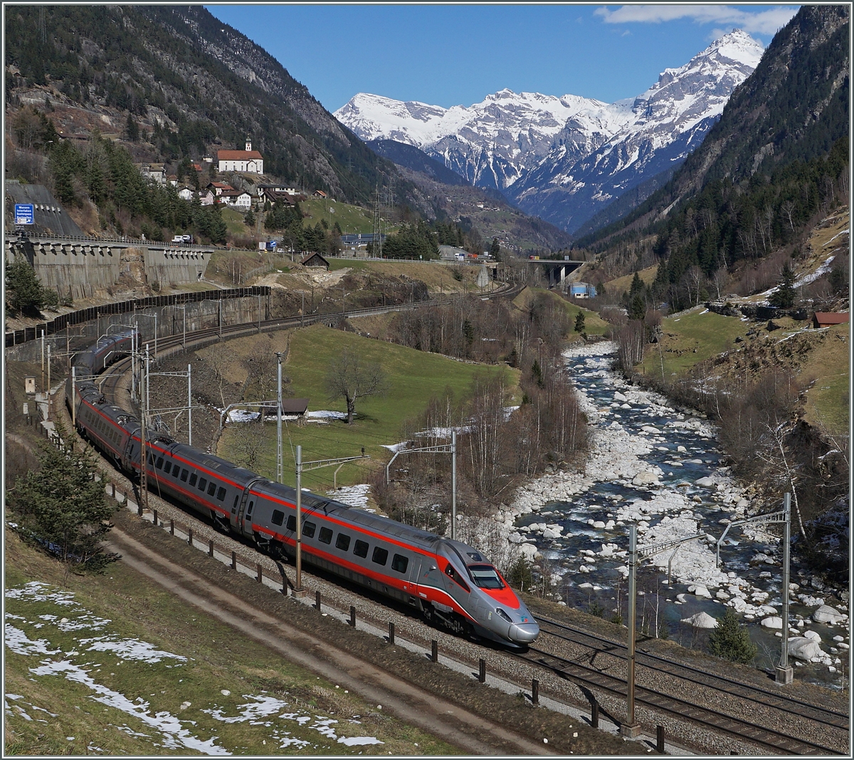 Das Bild zeigt einen FS ETR 610, der weiterhin im gefälligen Freccia Argento-Anstrich unterwegs ist, bei Wassen auf der Fahrt Richtung Zürich.