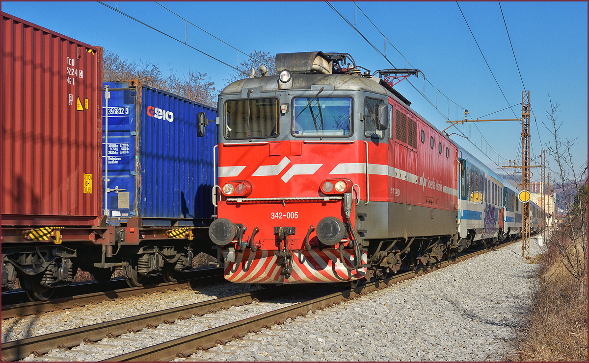 SŽ 342-005 zieht EC151 durch Maribor-Tabor Richtung Ljubljana. /23.1.2018