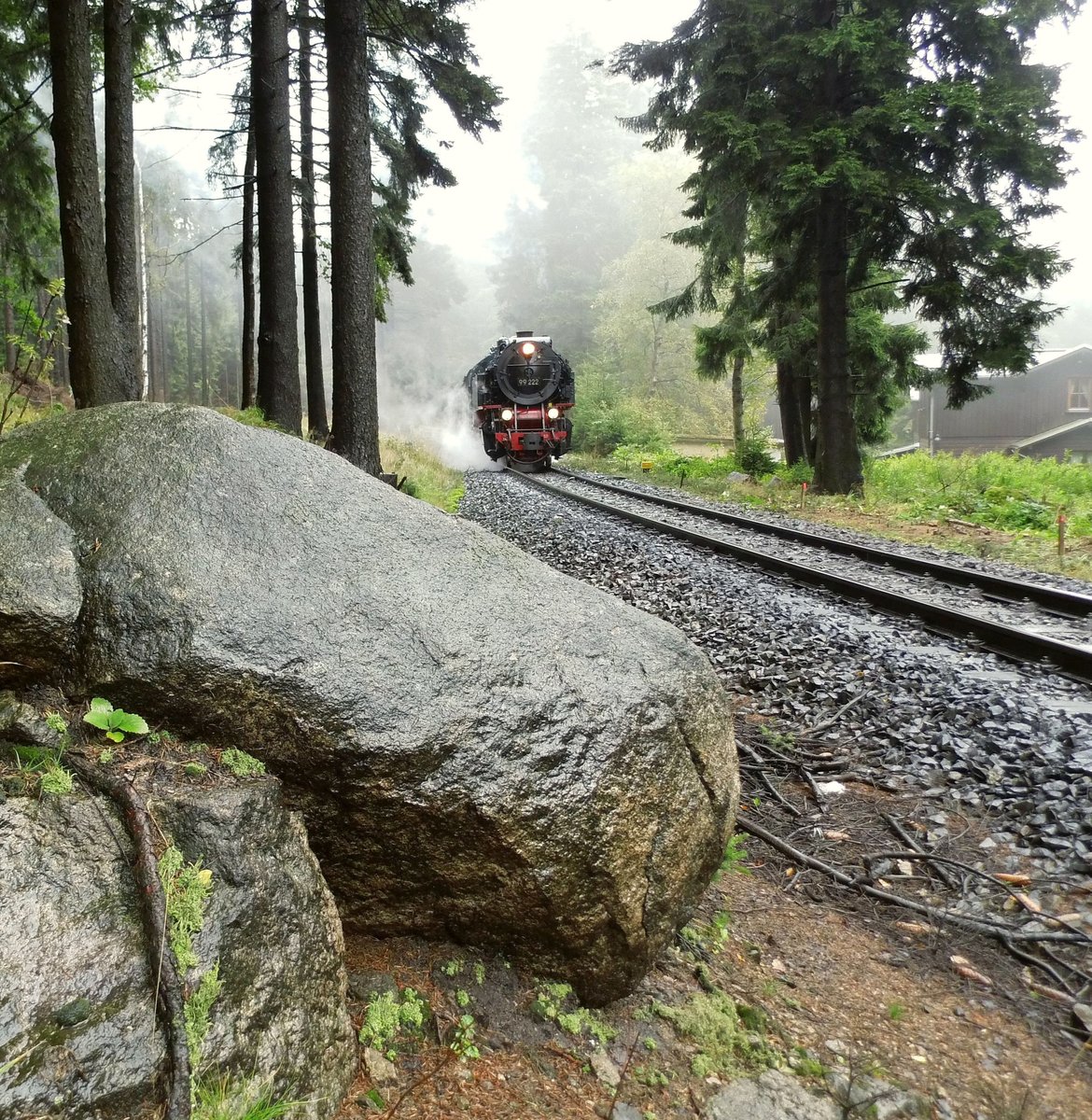 Wenn man so mit dem Traditionszug unterwegs ist, sind die Motive rar. Da der Zug während der planmäßigen Kreuzung/Überholung im Bahnhof Schierke nur im Wege wäre, wird er zum Gaudi der Gäste in den Wald rangiert. Das bietet wiederum Gelegenheit, den Zug "mal anders" zu fotografieren.