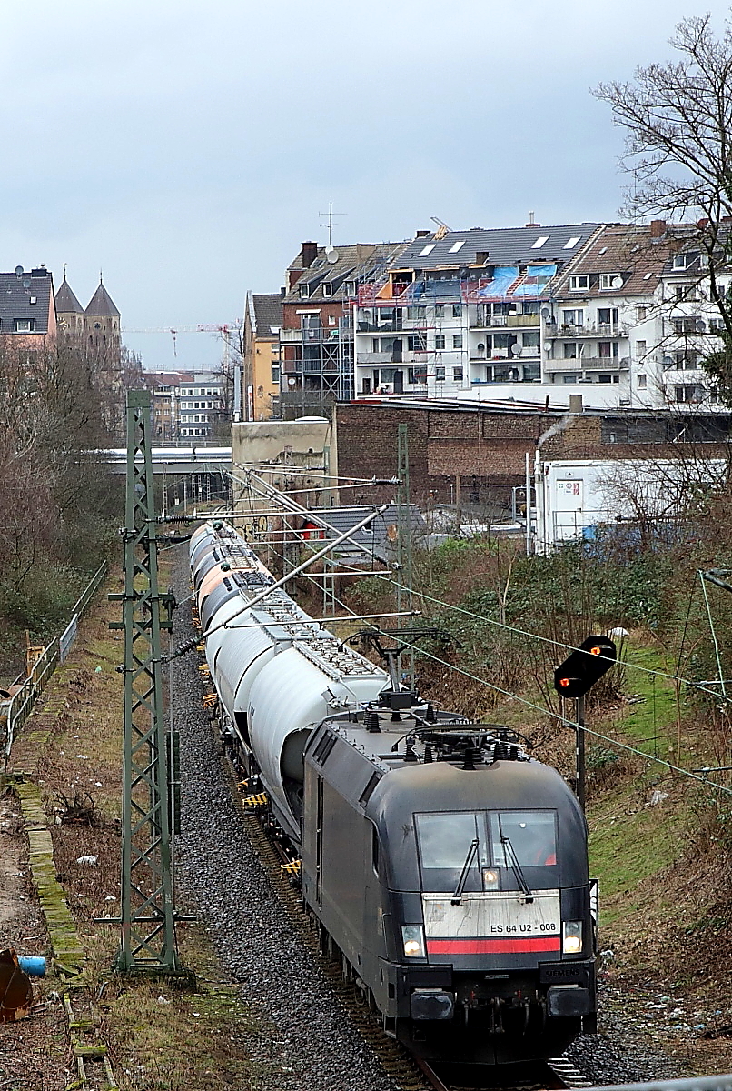 Zu den wenigen Zügen, die heute noch die Düsseldorfer Güterumgehungsbahn von Derendorf nach Lierenfeld befahren, gehört der Sodazug vom Solvay-Werk in Millingen nach Düsseldorf-Reisholz (Henkel-Werke). Am 01.02.2018 ist mit ihm die MRCE-Dispolok ES 64 U2-008 östlich der Moskauer Straße unterwegs.