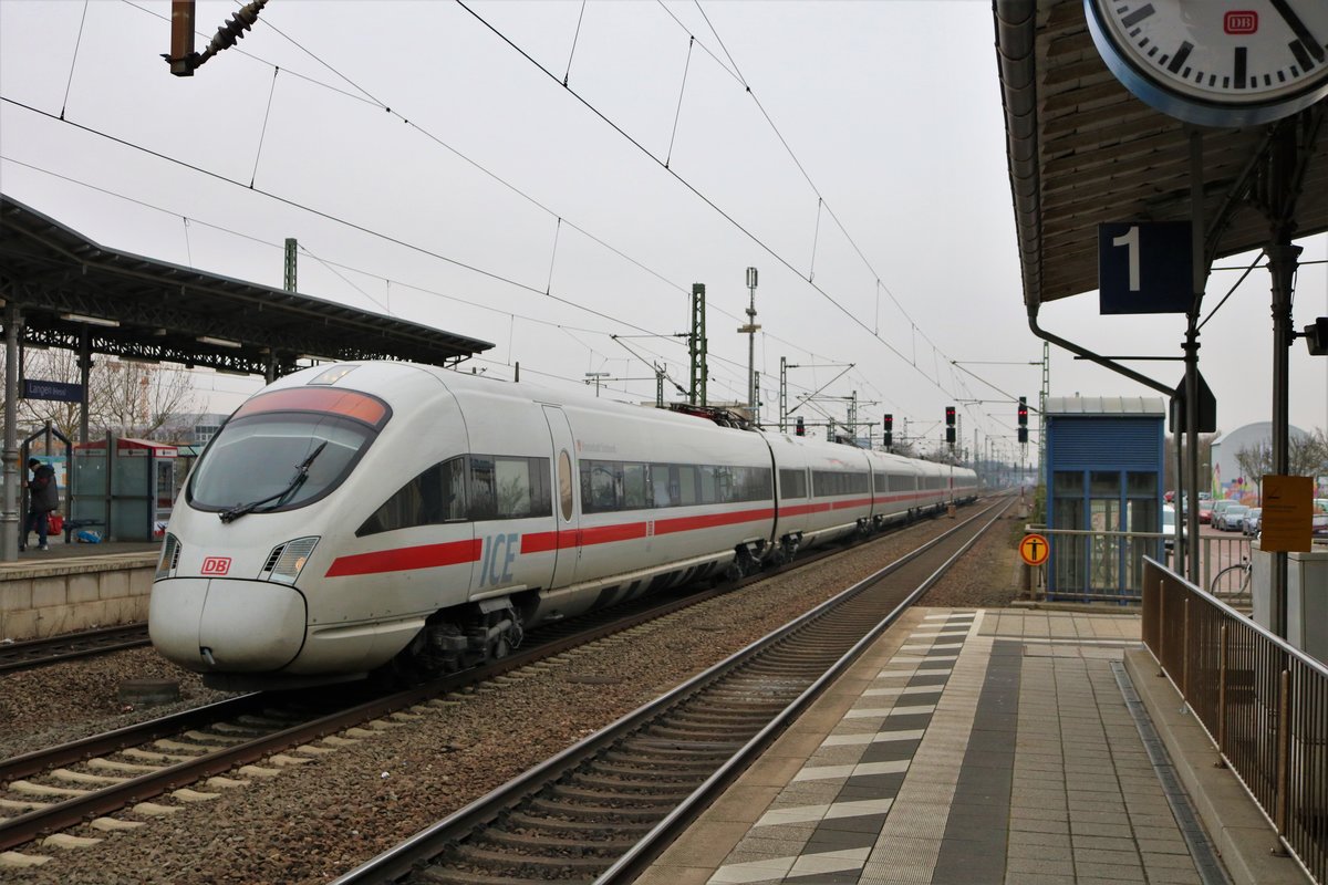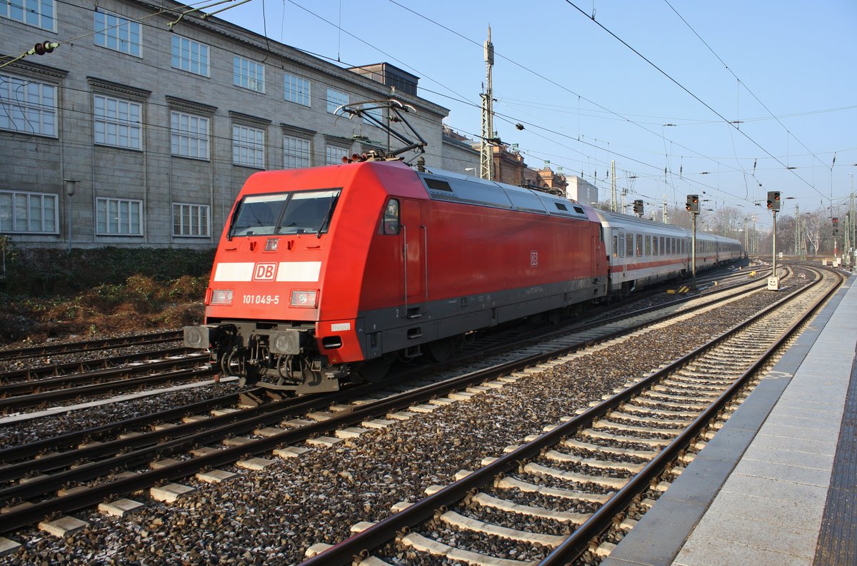 Nachschuss auf 401 515 (Tz 115  Regensburg ) als ICE 707 (Linie 18) von Hamburg-Altona nach München Hbf, der das Gleisvorfeld von Halle(Saale)Hbf durchfährt. Aufgenommen von der Delitzscher Straße. [26.1.2018 | 14:50 Uhr]